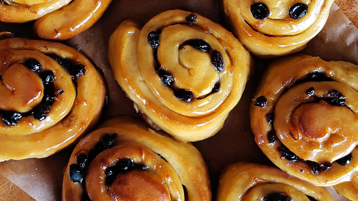 Orange | Smothered in sweet glaze & filled with orange zest, currants, & cardamom, these sticky honey buns are the perfect treat!